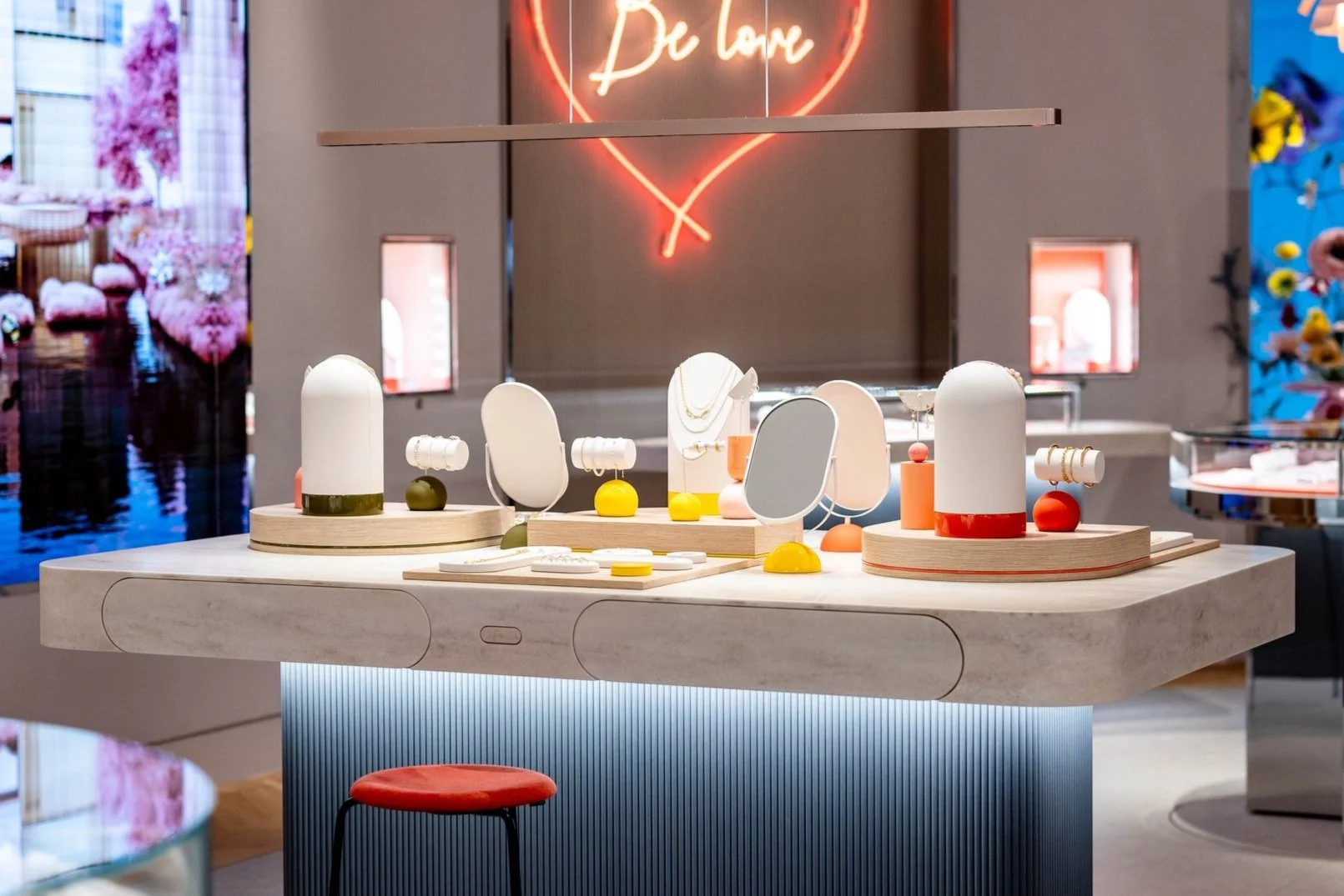 Working alongside the Global team on a brand new Flagship concept for Pandora, we led the concept development for the product displays for an aspirational and engaging jewelry display table. The objective of this space was to “enrich customers’ experiences through a culminating moment... [of] self-expression.” The brief was to develop an inviting, bold, eye-catching space while remaining accessible and smart. The three display spaces of the table required a cohesive concept, each with its design parameters. The Pandora team narrowed in a design concept that was a series of simple volumetric shapes paired with vibrant colors as the starting point, and the concepts evolved from there. These display programs launched in June 2024 with the opening of the Pandora Flagship in Copenhagen, Denmark, and were used both at the Style Bar and in the store’s window displays.