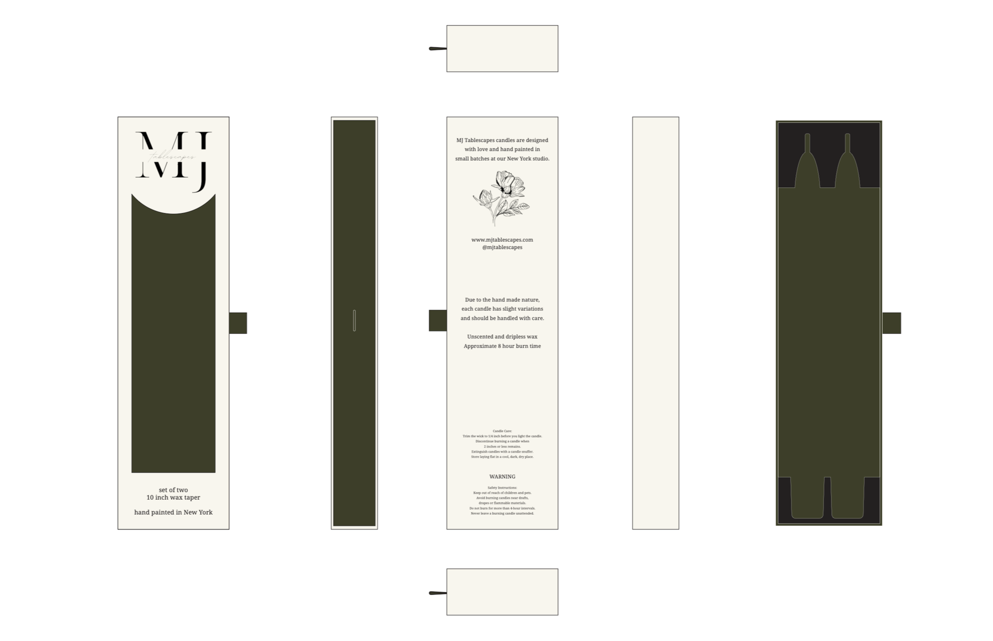 We were tasked with designing a luxury package that met both in-store display and shipping needs while elevating the product itself. The desire to have the hand-painted design visible while the box was closed was crucial, as was the protection of each taper during shipping. Taking these two objectives into consideration, we devised a drawer-style box with a grosgrain pull, incorporating a window on the front and a foam-padded interior.